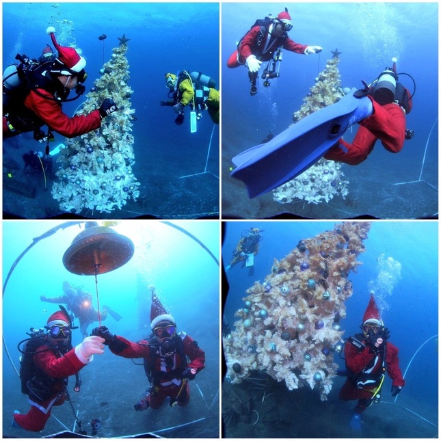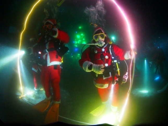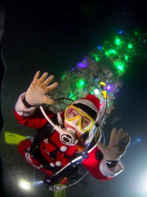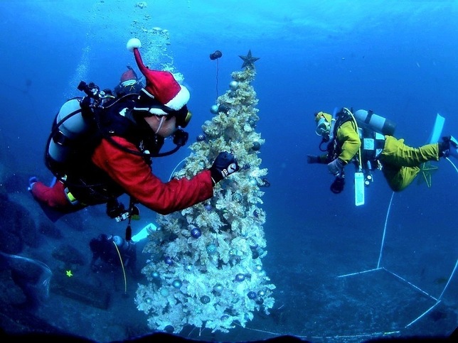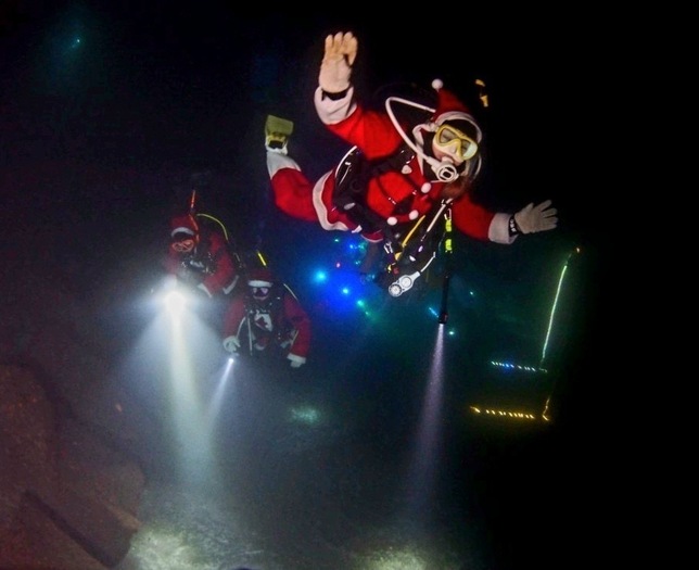 夜間ダイビングでサンタクロースの格好をして水中にクリスマスツリーを設置しました